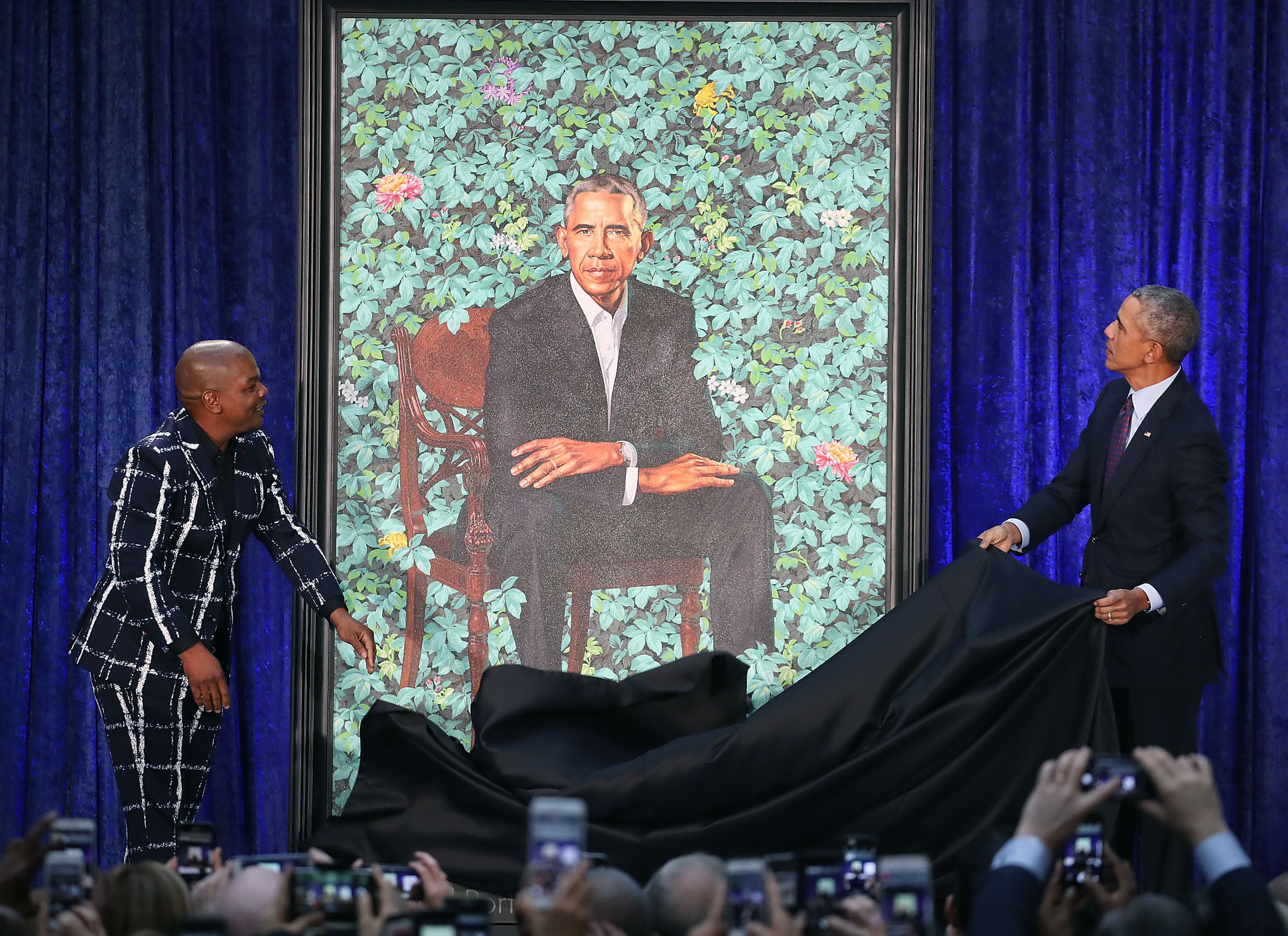 Kehinde Wiley's art illustrates people of color in scenes from old master paintings. His most notable oil on canvas piece depicts President Barack Obama, the 44th president of the United States and the country's first Black president, which was commissioned by the Smithsonian Institution’s National Portrait Gallery on February 12, 2018. It was the first time the National Portrait Gallery commissioned two Black artists, Wiley and Amy Sherald, who was commissioned to paint Michelle Obama's portrait.