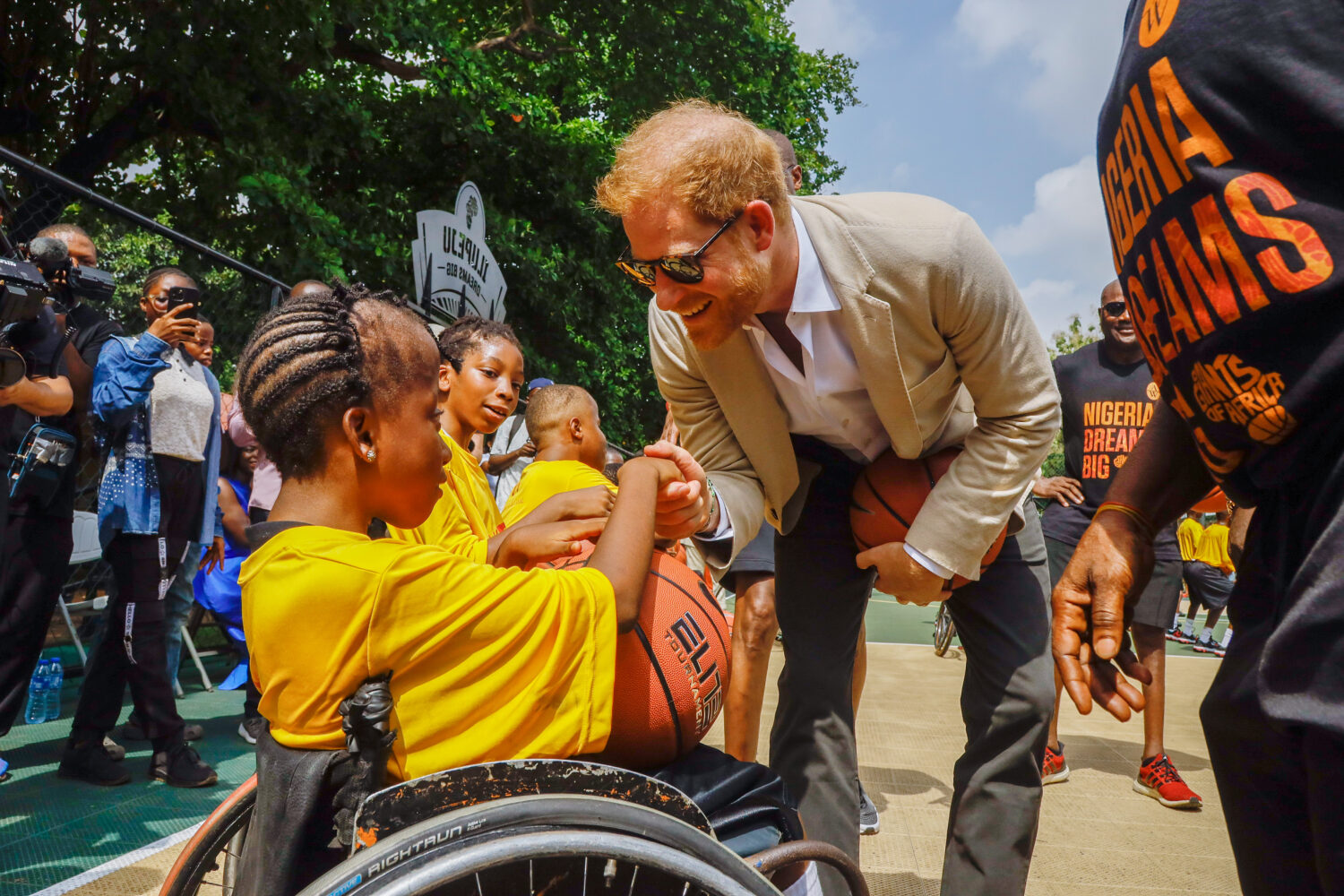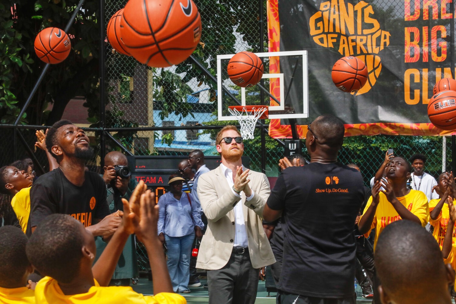 On the couple's final day in Nigeria, they traveled to Lagos. Many of the events they attended during their stay were held in Nigeria's capital Abuja. While on tour, Meghan was gifted a traditional Nigerian skirt, which she wore to Lagos. Upon their arrival, they were greeted at the airport by local officials and welcomed with a traditional dance performance. From the airport, the Duke and Duchess traveled to Ilupeju Senior Grammar School to join Masai Ujiri, the President of the Toronto Raptors and the Founder of Giants of Africa, at the organization's basketball clinic. The Giants of Africa charity strives to empower African youth through education, mentorship and basketball programming. While there, the couple announced that they would be partnering with Ujiri's organization, Giants of Africa, through their charity, The Archewell Foundation. The partnership will help expand the Giants of Africa programming to help increase accessible sport for Nigerian youth.