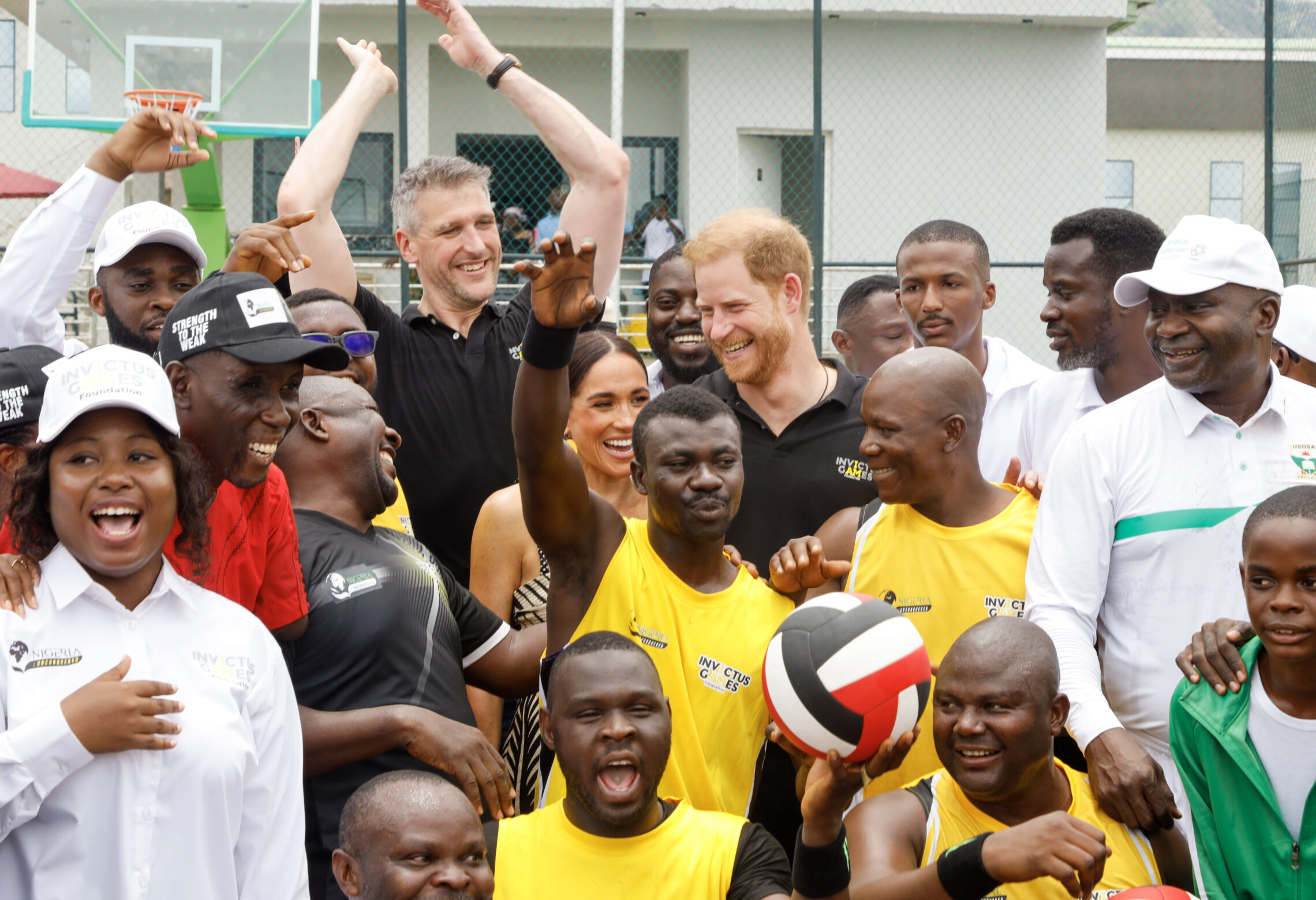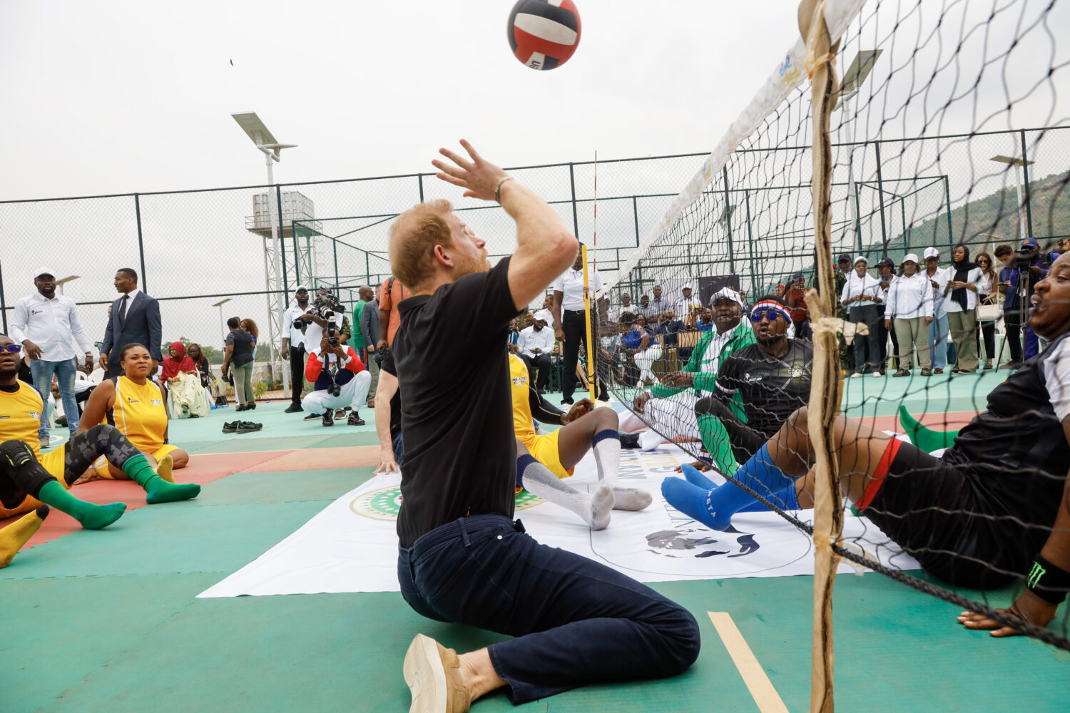 The couple's second day in Nigeria was dedicated to highlighting Nigeria's involvement in Prince Harry's Invictus Games. Prince Harry and Meghan Markle visited a training session organized by Nigeria: Unconquered. The non-profit organization was inspired by Prince Harry's Invictus Games, and works to support the rehabilitation of injured and wounded service members. The Duke and Duchess were invited to watch one of their volleyball games played from a seated position, one of the organization's many sports programs used for recovery and recuperation. It is also worth it to note that the Invictus Games have included seated volleyball as a program since 2014. After the start of the match, Prince Harry was soon invited to join the game.