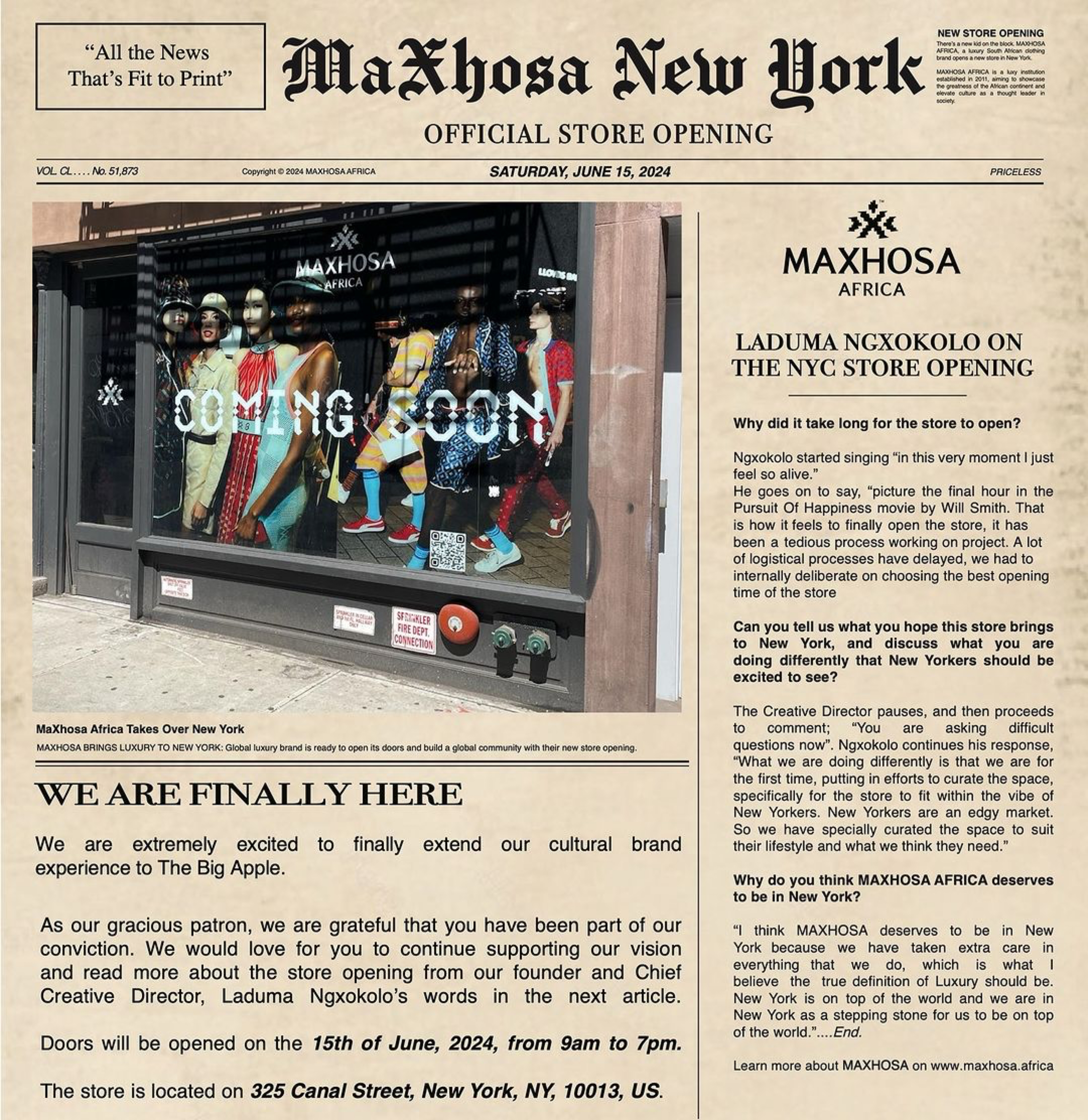South African designer Laduma Ngxokolo is opening a brand new location for his knitwear brand MAXHOSA Africa. The store will be located in New York's trendy and luxe shopping neighborhood Soho. Laduma made the announcement on Instagram with a post mimicking a newspaper article. The store opens in Soho on June 15.